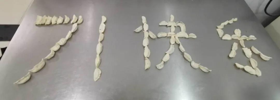 中午12:00,食堂的工作人员刚刚将食材分发下去,同学们便撸起袖子、跃跃欲试,和面、擀面皮、包饺子,大家分工明确、团结协作。刚开始,尽管同学们包得十分卖力,但稍显笨拙的手法,依旧使饺子的造型五花八门、歪歪扭扭,每当“奇葩”造型的水饺横空出世,都引来同学们的围观和哄笑。经过近一个小时的不断尝试和同学间的互帮互助,一个个玲珑饱满的饺子终于陆续出炉,大家用精挑细选的饺子围成“71岁快乐”的字样,表白祖国母亲。看着自食其力的劳动成果,同学们有的拿起手机和家人视频“炫耀”,有的拍了“走心”照片留作纪念,还有的迫不及待地煮熟品尝起来。