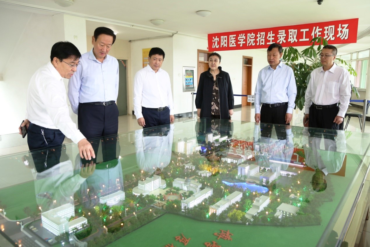 9月4日上午9点,沈阳市人大常委会主任潘利国一行到沈阳医学院调研指导工作。市人大常委会秘书长孟昭贵、市人大教科文卫委员会主任委员初立华,沈阳中城国有资产经营集团有限公司董事长董伟钧、沈阳医学院党委书记陶庆才、院长任甫教授等陪同调研。潘利国主任一行深入考察了沈阳医学院招生工作现场、国际学院施工现场、学生生活区、康复医学院实验室和临床教学实验中心,陶庆才书记和任甫院长就学校整体布局、招生就业工作、秋季学期开学返校准备工作、附属医院建设等情况做了全面介绍。得知沈阳医学院高考生源质量良好,就业形势喜人,各项工作蓬勃发展,潘利国主任十分欣慰并给予高度肯定。