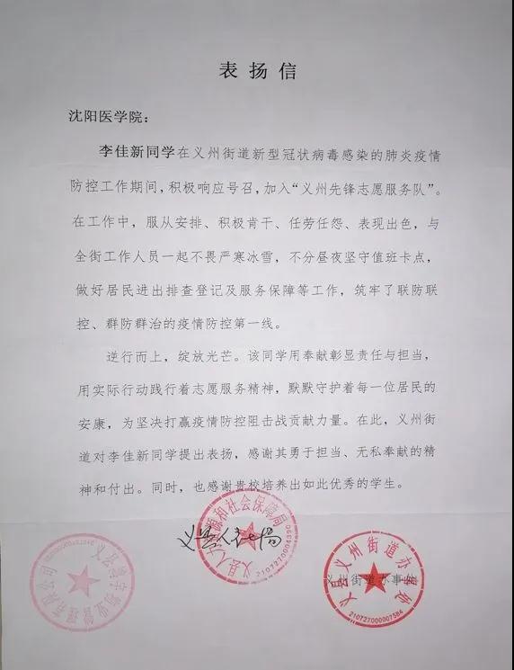 近日,沈阳医学院收到了来自义县义州街道办事处的一封表扬信,信中对我院的李佳新同学积极投身于疫情防控工作表示感谢,表扬了其在志愿服务期间表现出的积极肯干、任劳任怨、无私奉献等优秀品质。