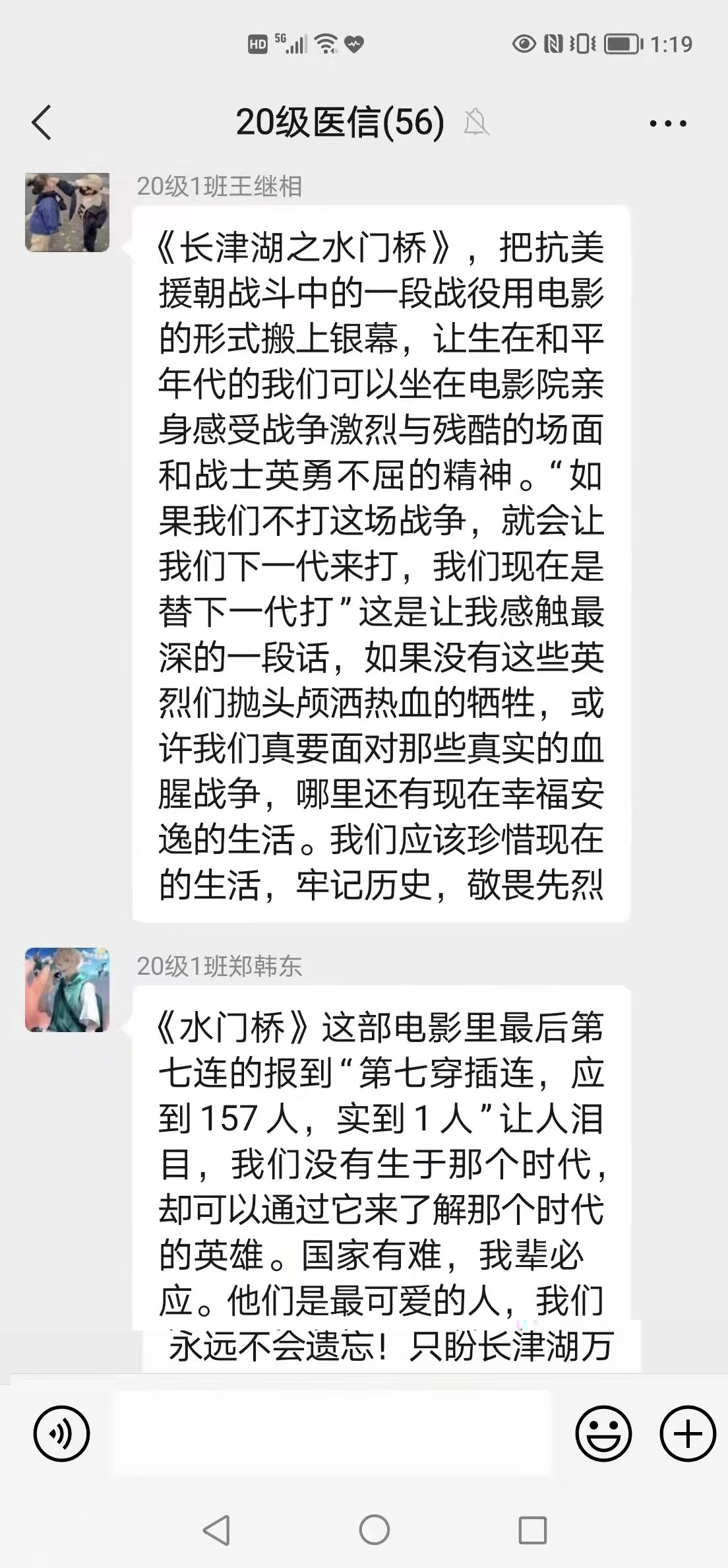 观影结束后,学生们自发地在班级群里写下了感言。学生们表示,要“铭记历史,珍爱和平”,继承和发扬先辈们的爱国主义精神,让美好的青春在实现中华民族伟大复兴这一梦想的征程中绽放光彩,用行动践行“请党放心,强国有我”的庄严承诺。