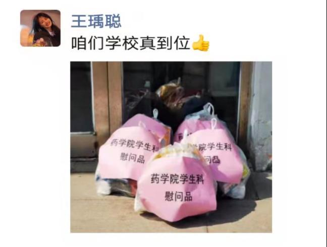 2021级药本二班黎雨同学说:“学校为我们送来口罩和餐券,让我感受到了沈医的温暖是真挚的,炙热的,我爱沈医!”