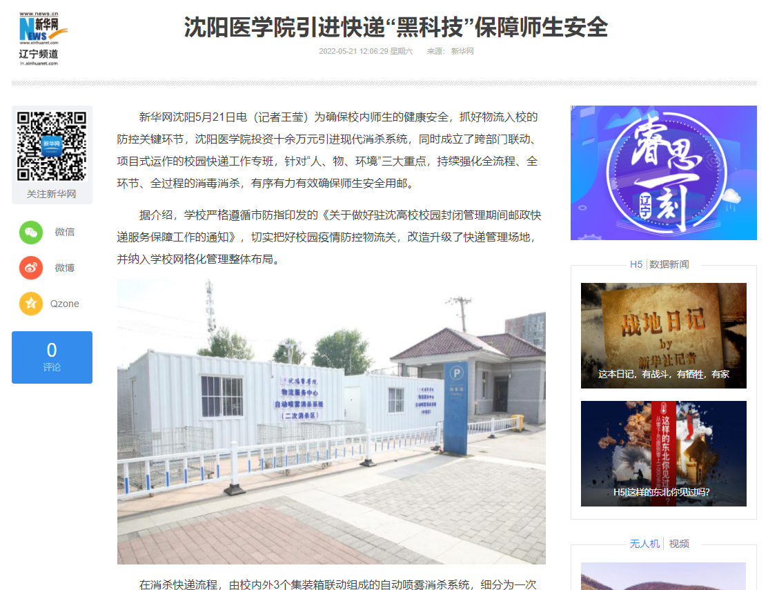 新华网报道沈阳医学院引进快递“黑科技”保障师生安全