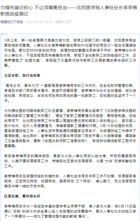 健康报:巾帼先锋记初心 不让须眉勇担当——沈阳医学院人事处处长李荣梅教授战疫侧记