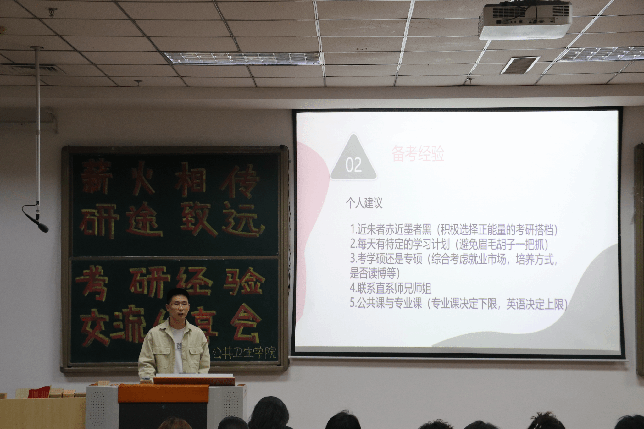 为帮助低年级学子明晰考研动态与趋势,搭建优质信息互通平台,公共卫生学院面向全体学生,于2025年 5月15日举办了“薪火相传,研途致远”考研经验交流分享会。本次活动邀请了本院党总支杨威书记、吴杰副院长、学生科科长程欣慧老师、辅导员李航老师及8名考研成功的学长学姐一同参加。本次活动公共卫生学院全体同学参加。
